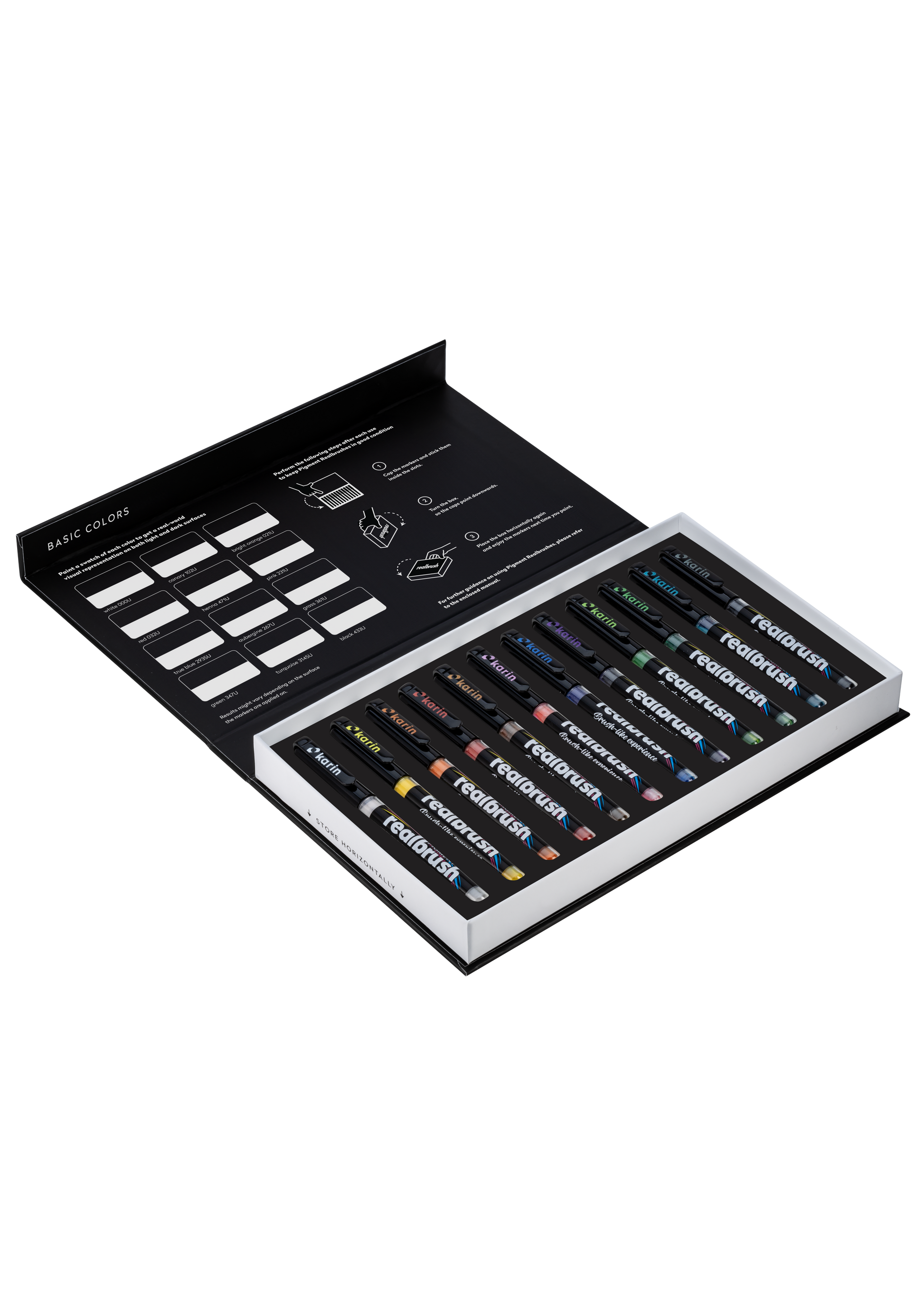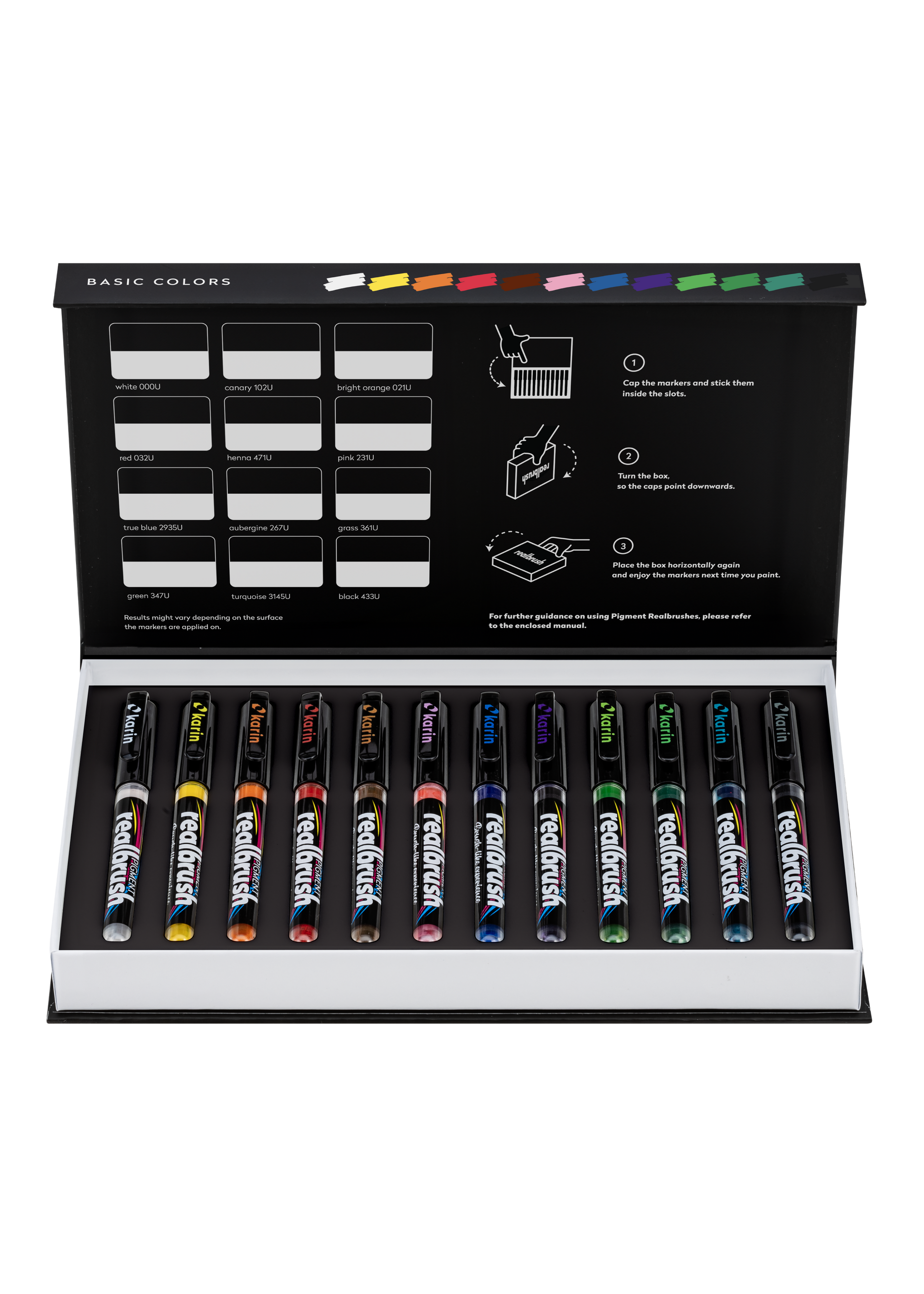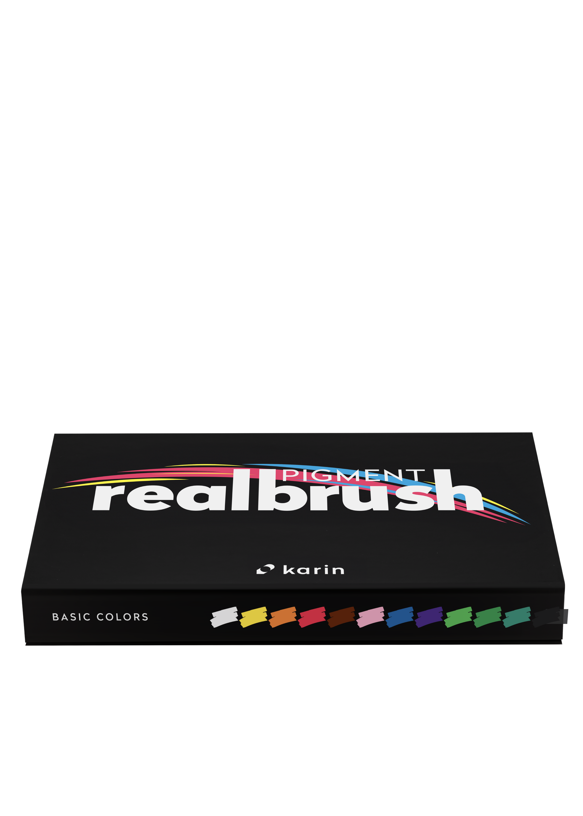 Realbrush PIGMENT Basic Colors - a collection containing 12 brushes in an exclusive, easy-to-storage and protective case. Using Realbrush Pigment paint brushes is similar to using acrylic paints, but in a modern and practical form of a marker with a paint brush (so-called Realbrush marker). Their opaque color can be used on paper, metal, glass, plastics, wood, textiles and many other surfaces. Realbrush Pigment paint brushes contain 2.4 ml of non-toxic opaque organic Pigment-based paints. They have been produced in the "free ink" technology thanks to which they allow 100% paint consumption. Brush Size: 4mm.